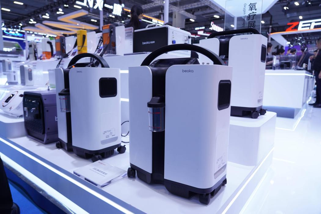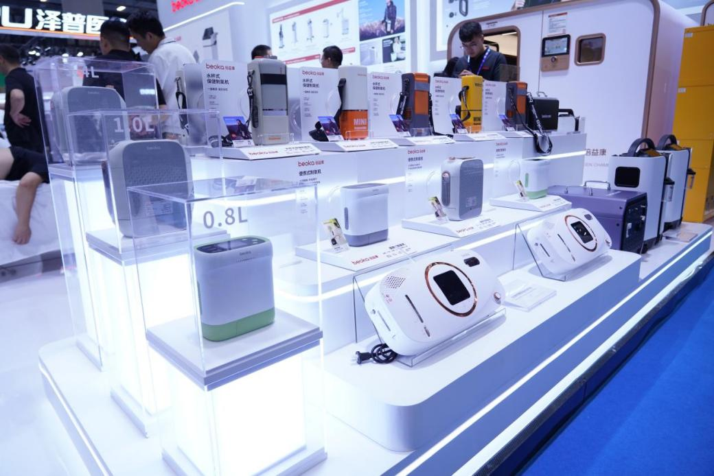 在户外使用的随身便携式制氧机,可根据呼吸节奏智能出氧,覆盖0.5L、0.8L、1L、1.2L、1.4L多款型号,等效于普通制氧机的2L至6L,兼顾轻量化设计与长效续航,大幅提升用户出行自由度;在室内使用的5L医用制氧机,搭载4缸静音压缩机,氧流量最大挡位时噪音小于42dB(A),并内置锂电池,停电后可维持约30分钟应急供氧;在车上使用的车载弥散式制氧机,适用于不间断的车内供氧,使车厢犹如天然氧舱;分体弥散式制氧机,为室内空间整体增氧,无需鼻氧管,打造独享舒适的富氧环境;服务于高原旅游市场的倍益康氧饱饱共享制氧机,仅重1.5kg,双电池续航可达5小时,可稳定产出浓度大于90%的氧气,即使在海拔6000米环境下仍能稳定运行,并可实现扫码租借、异地归还;本次展出的微压氧舱,可营造增压富氧的环境,有助于恢复机体活力、提升睡眠质量及养生保健。